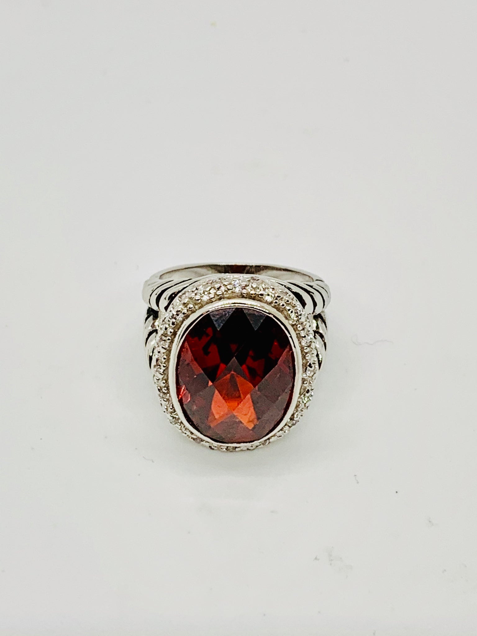 Designer style ring in sterling silver. Red cubic zirstone with braided band.